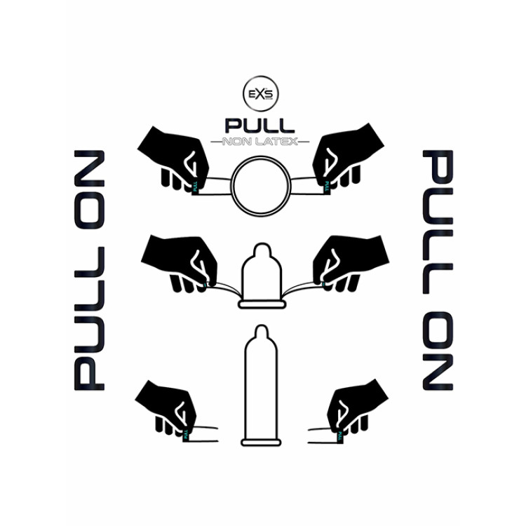 EXS PULL er unikt utforsmet med "strip-system" teknologi og lar kondomene rulle seg sikkert på huden for en tettsittende og behagelig passform. Kondomene er laget av hypoallergent ikke-lateks materiale og er smurt med en silikonbasert formel som gjør de perfekt for vaginal, oral og analt samleie. Uten gummi-lukt eller smak. Kompatibel med alle vann- og silikonbaserte glidemidler.