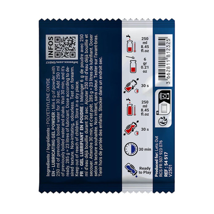 Bare bland pulveret med vann, rør godt og vips har du et høykvalitets profesjonellt glidemiddel som gir glatt, langvarig og trygg bruk.
