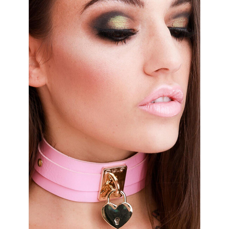 Collaret har en hjerteformet lås på fremsiden, som fungerer som en solid festemekanisme og et elegant designelement, samtidig som du kan feste lenker og andre redskaper til.