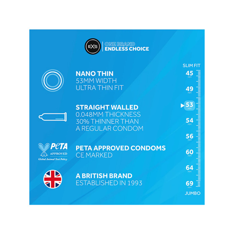 EXS Air Thin er blant verdens tynneste latexkondomer, opptil 30% tynnere enn vanlige kondomer. De har en bredde på 53mm, ingen latexlukt og er supertynn med kun 0,048 mm tykkelse.