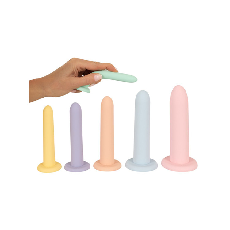 Settet kommer med seks dildoer i forskjellige, delikate pastellfarger. De varierte størrelsene gjør det enkelt å gradvis øke intensiteten og tøyningsgraden, som er ideelt for person som gjennomgår behanling for vaginisme eller kjønnskorrigerende kirurgi.