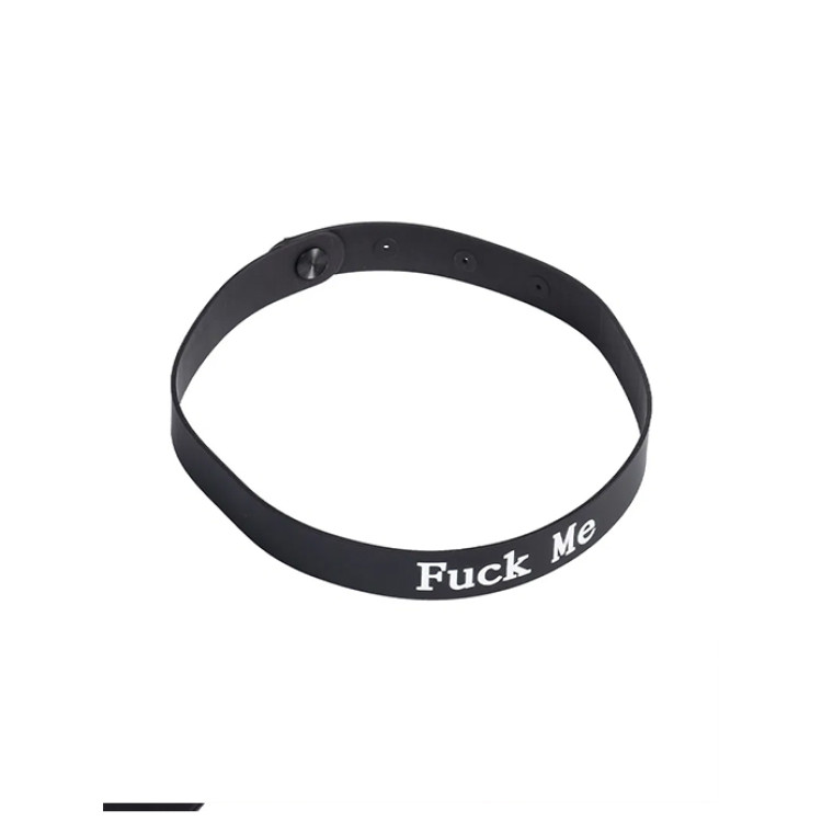 Collar i silikon med teksten Fuck Me uthevet i hvit skrift.